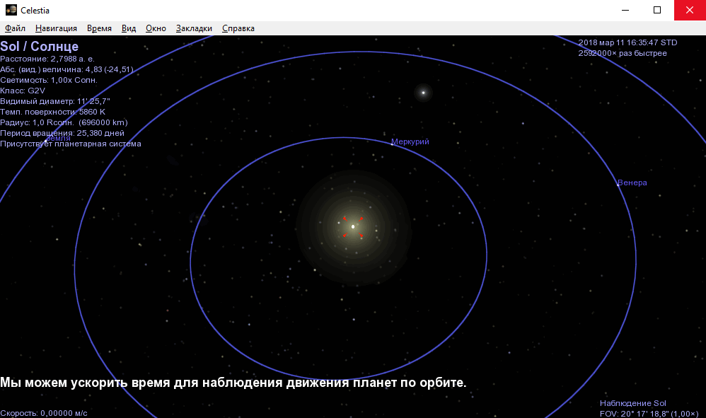 Если вы выберите для наблюдения планету Солнечной системы, а затем приблизите ее, то небесный объект начнет перемещаться в окне программы в режиме реального времени, и быстро уйдет из вида. Для постоянного слежения за выделенным объектом нажмите на клавишу «пробел».