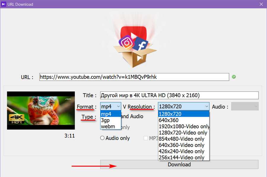 В появившейся форме указываем ссылку ролика, выбираем параметры загрузки – формат видеофайла, разрешение (максимальное 1920х1080), если нужно скачать только звук, то указываем тип загрузки «Audio only». И если хотим скачать звук в формате MP3, то указываем это, иначе по умолчанию аудиофайл будет скачан в формате M4A. В итоге нажимаем кнопку «Download».