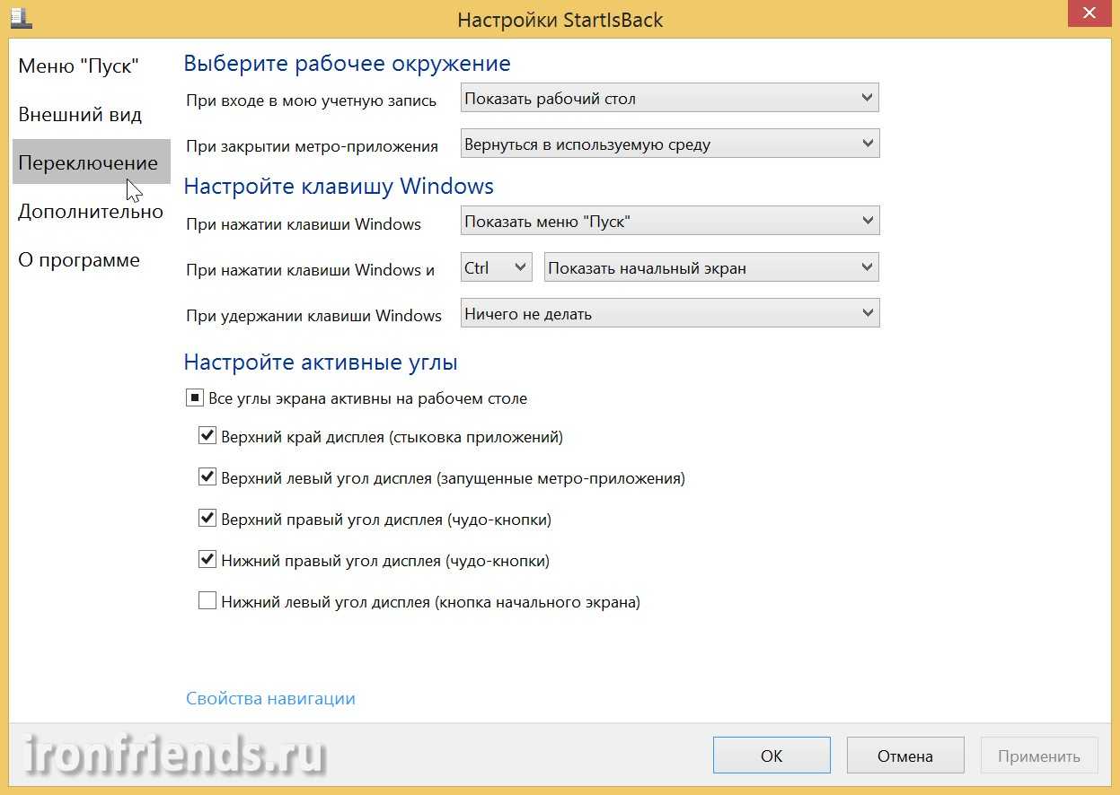 Здесь можно задать поведение меню ПУСК, включить или отключить те или иные пункты меню, изменить значок кнопки ПУСК, стиль оформления, цвет и прозрачность фона, настроить некоторые клавиши и активные углы Windows 8.1. Также имеются некоторые опции, которых нет в предыдущей программе.