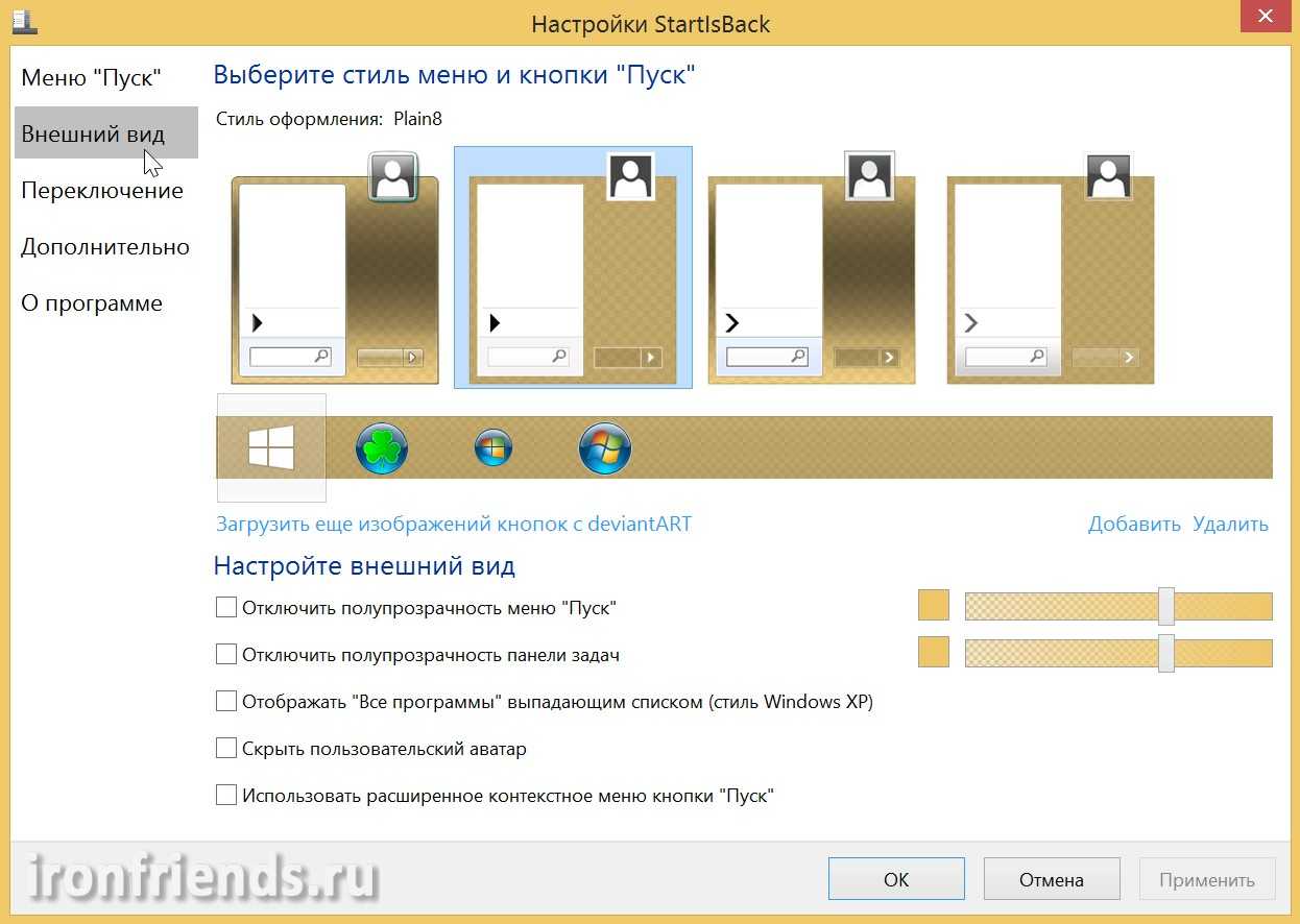 - Можно изменить внешний вид кнопки «Пуск». Для этого поставьте галочку на соответствующий параметр в нижней части окна. Изначально представлено несколько стандартных вариантов внешнего вида кнопки, но вы можете добавить свои с компьютера, нажав на кнопку «Выбрать изображения…».