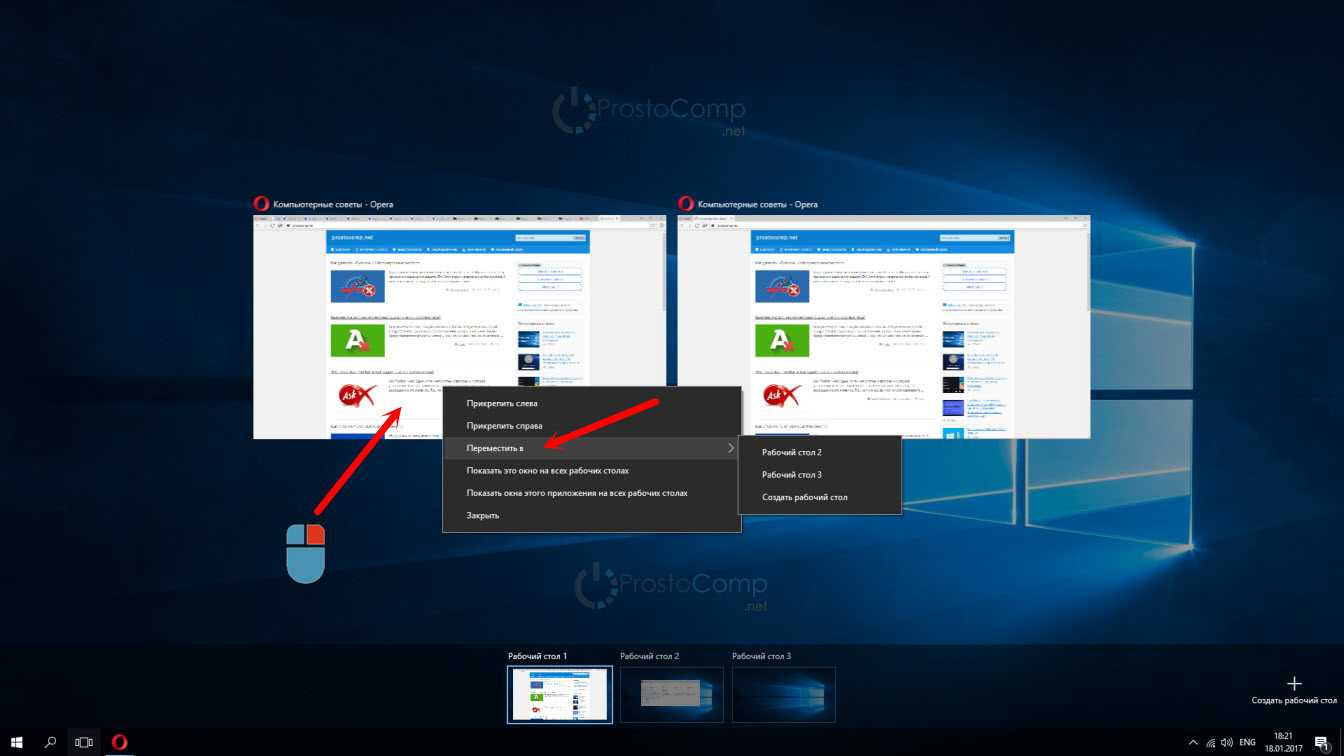 Также в Windows 10 предусмотрена возможность перемещения активных приложений на другие виртуальные рабочие столы – достаточно просто кликнуть правой кнопкой мыши на нужной программе, выбрать в контекстном меню пункт «Переместить в» и определиться с рабочим столом. Для увеличения скриншота нажмите на него.