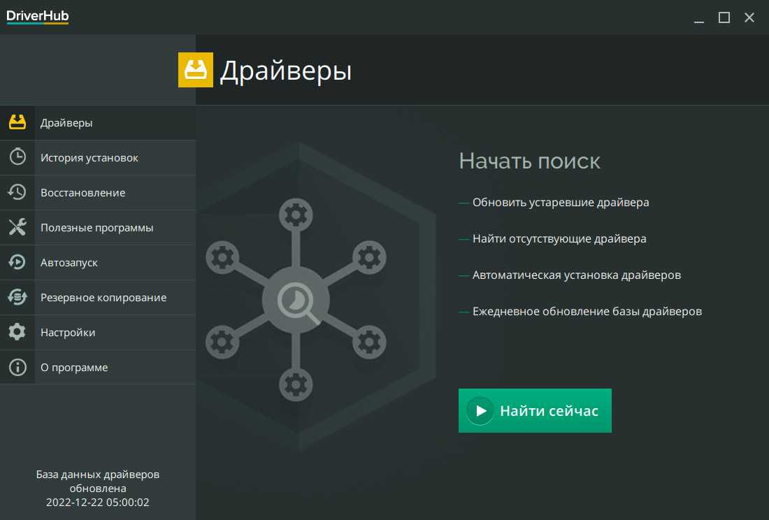 DriverHub — это бесплатный менеджер драйверов. Он позволит избавиться от этой необходимости ручной установки драйверов, полностью автоматизировав процесс поиска, загрузки и установки программного обеспечения. Сами драйверы хранятся на удаленном сервере (облачном хранилище). Программа DriverHub не занимает много места на диске. Также ее можно установить прямо на флешку и затем использовать на любом компьютере, получив портативную версию.