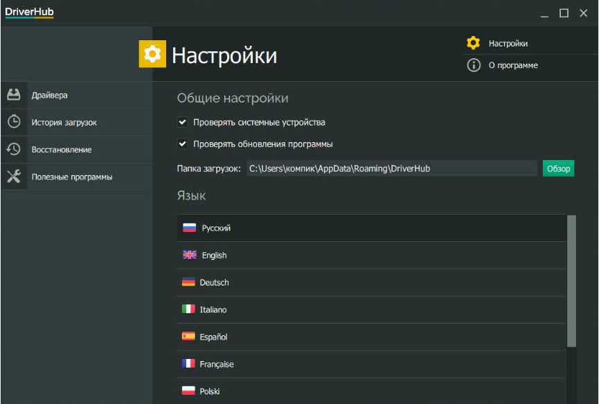 Непосредственного отношения к драйверам он не имеет, а представленные в нём опции — это ссылки на штатные утилиты Windows, собранные в одном месте для обеспечения к ним быстрого и удобного доступа. Что касается настроек, их в программе самый минимум. В них вы можете задать собственную папку для загрузки драйверов, указать, нужно ли проверять наличие обновлений самой DriverHub и драйверов для системных устройств, а также изменить язык интерфейса.