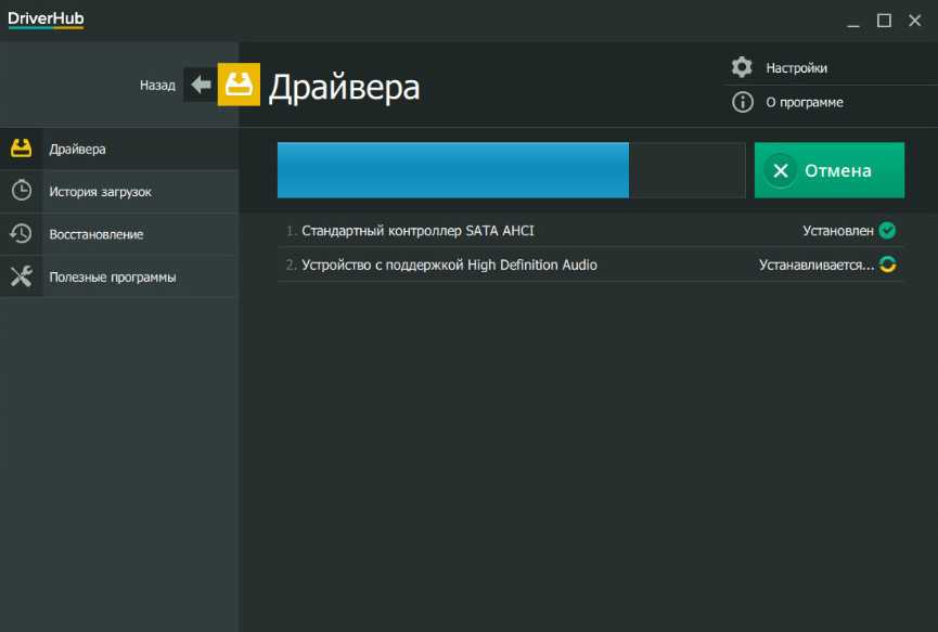 Удостоверившись в правильности выбора, нажмите кнопку «Установить». DriverHub скачает драйвера с официальных источников и произведет их установку.