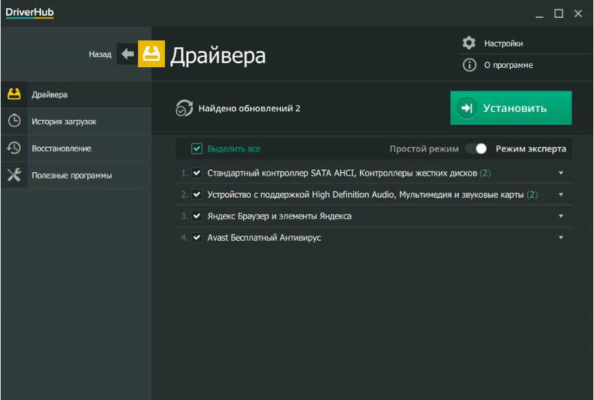 3. Переключаемся на Режим эксперта и устанавливаем галочки напротив названий устройств, драйверы которых должны быть установлены или обновлены: