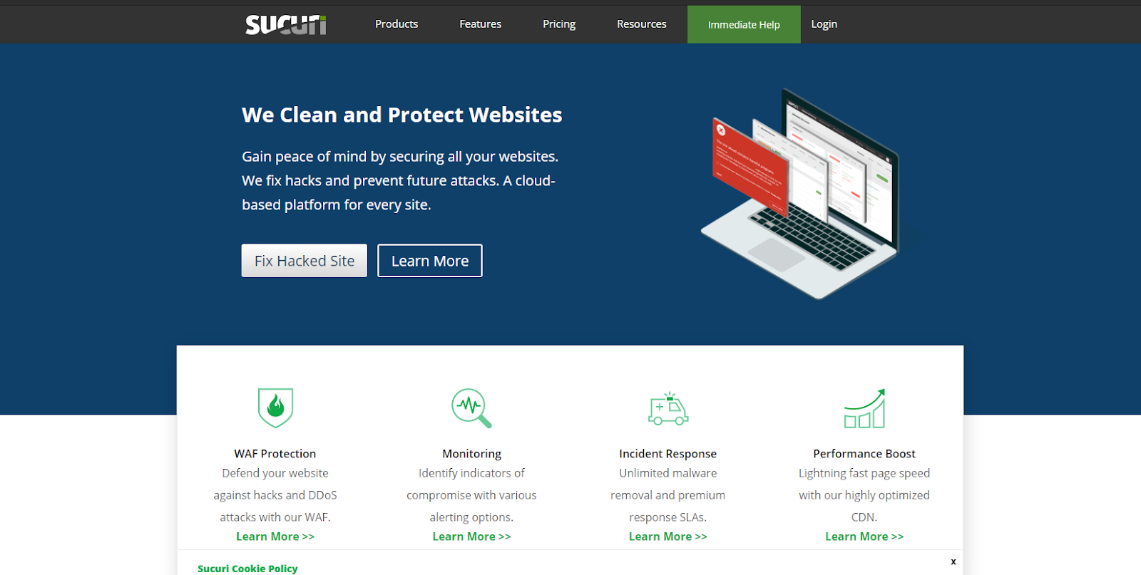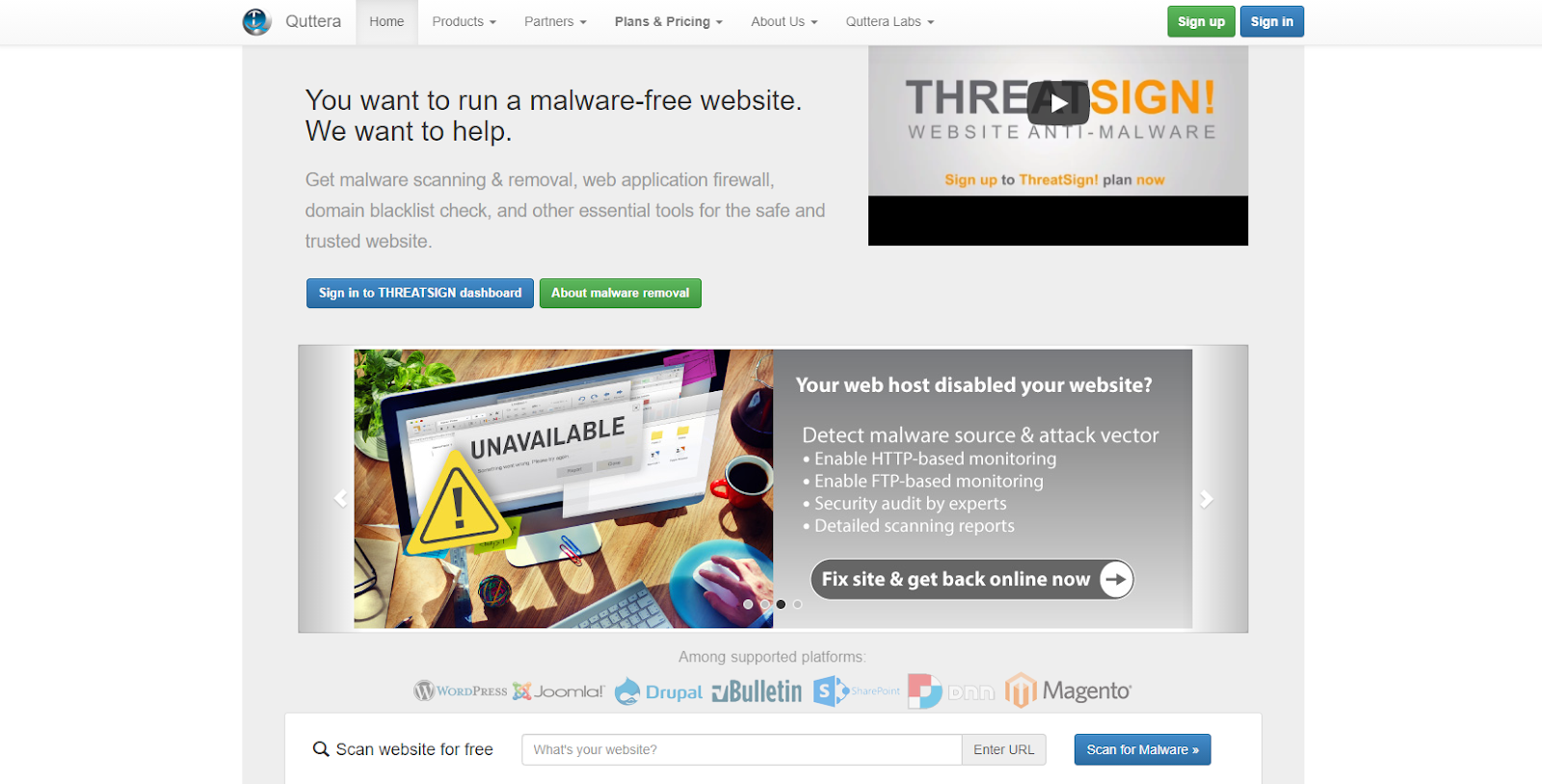 Sucuri хорош тем, что обнаруживает спам-ссылки и опасные скрипты, проверяет актуальность версий CMS и веб-серверов. Для использования надо зарегистрироваться и выбрать тарифный план. Несмотря на то, что цены могут показаться высокими, сервис предлагает полную поддержку и даже удаление вредоносного кода специалистами.