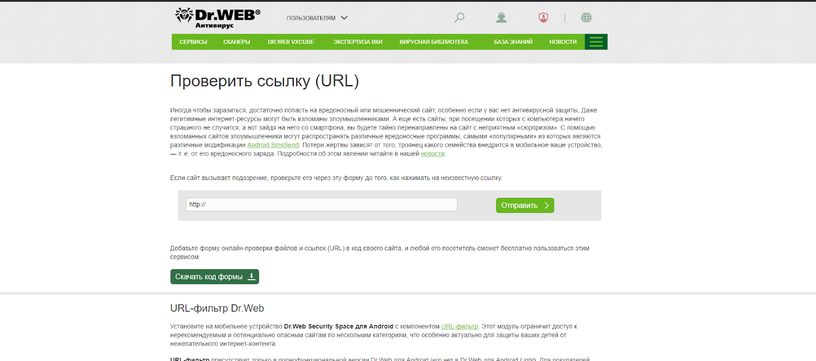Всё, что нужно, ввести URL сайта в соответствующее окошко и нажать «Отправить», после чего Доктор Веб проверит уязвимые файлы и предоставим вам отчёт.