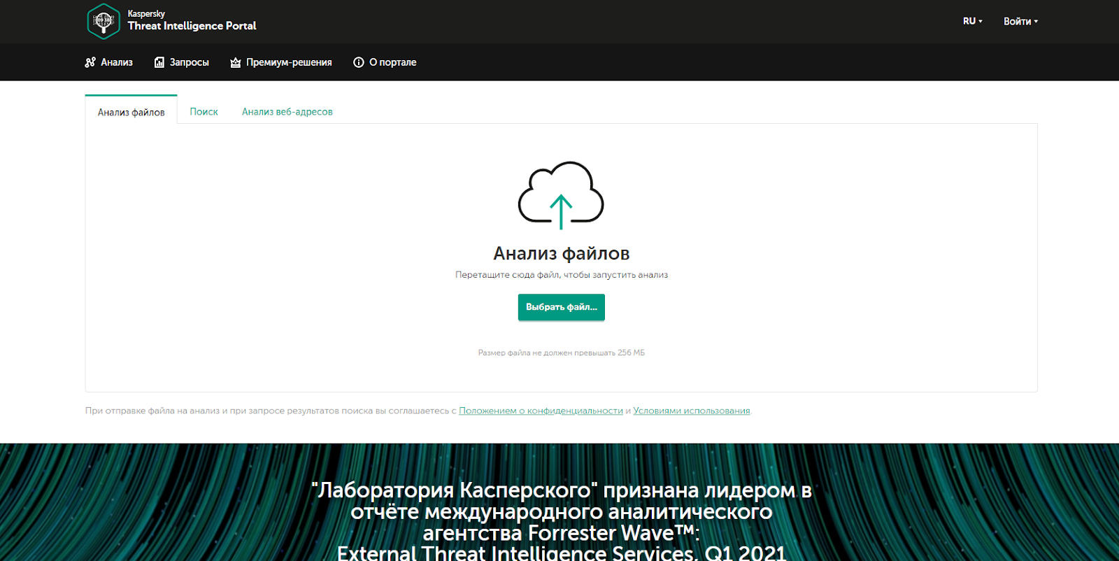 Наверное, один из самых популярных русскоязычных антивирусов, который выполняет и проверку сайтов. В нём можно проверить файлы размером до 50 МБ простым перетаскиванием мышкой. После проверки пользователь получит результат в виде отчёта, которая может содержать три статуса: плохая репутация, хорошая или неизвестная.
