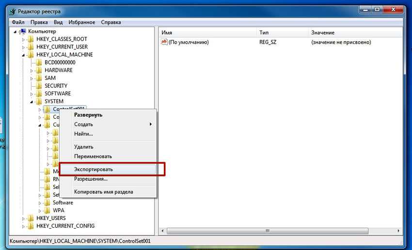 Перед редактированием Реестра любой версии Виндовс (в том числе и Windows 7) не забываем для подстраховки создавать его резервную копию. Для этого в редакторе нужно на вкладке «Файл» выбрать команду «Экспорт». Избрать «Весь реестр» внизу открывшегося диалога. Присвоив имя и указав место — «Сохранить»: