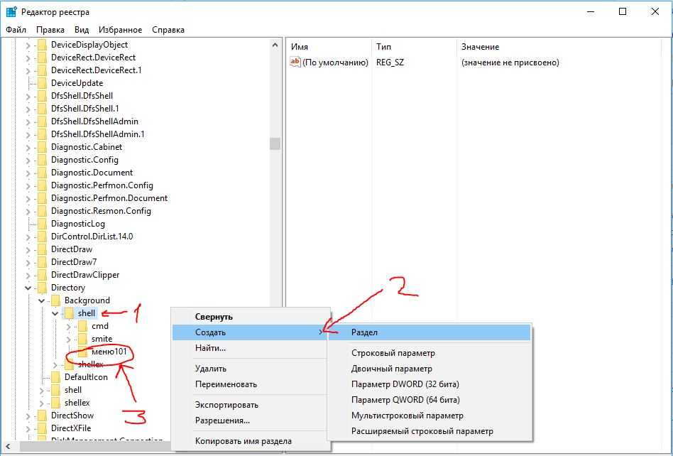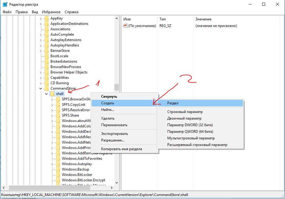 Вот как раз сейчас в данном разделе мы и будем с вами творить. Правой кнопкой мыши нажимаем по подразделу Shell, далее выбираем пункт «Создать», потом — «Раздел».