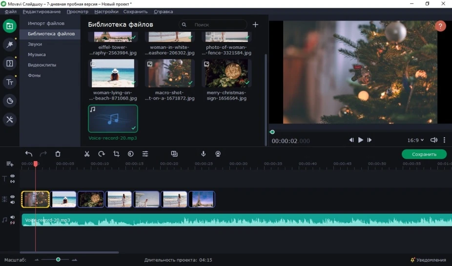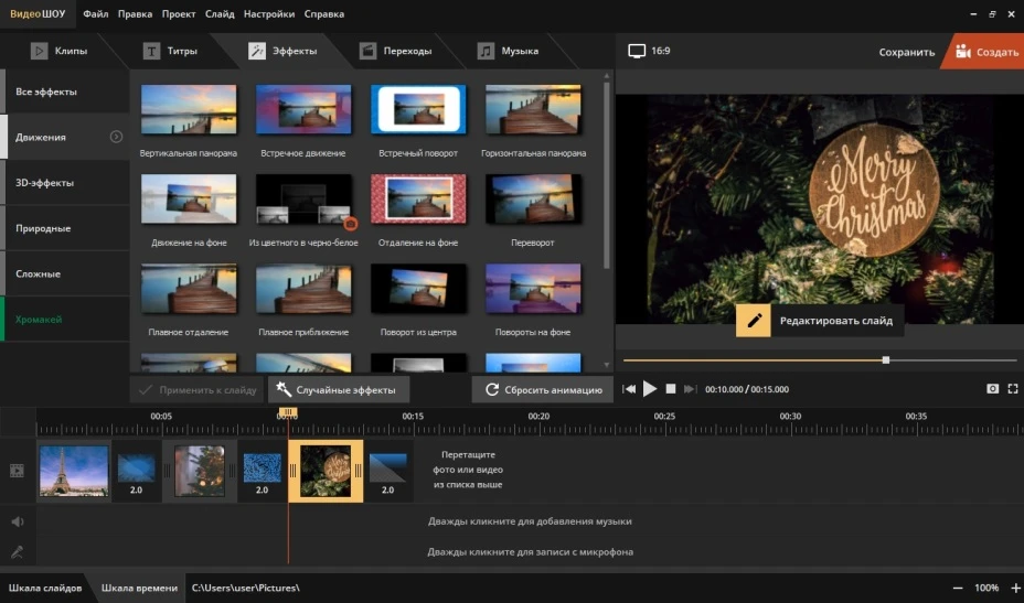 ВидеоШОУ – профессиональный редактор для монтажа и обработки видео. Также его можно использовать для создания видеороликов из фотографий. ВидеоШОУ позволяет добавлять неограниченное количество файлов, накладывать музыку, записывать закадровые комментарии. Есть возможность добавления переходов и создания анимационного видео. В программу встроен Мастер создания видеошоу, который соберет проект за несколько минут – достаточно загрузить нужные файлы.