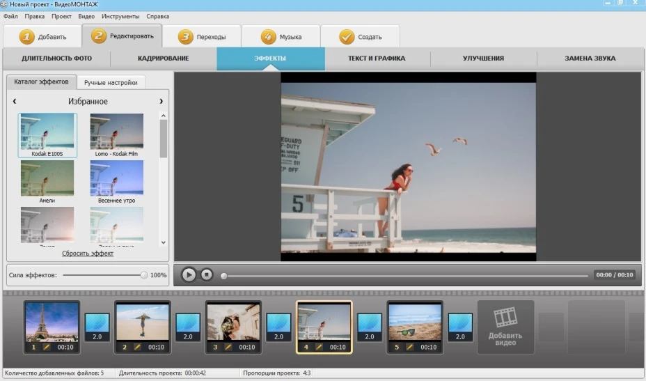 ВидеоМОНТАЖ – мощный редактор для монтажа и создания слайд-шоу. Простой интерфейс на русском языке с пошаговым принципом действия поможет легко и быстро создать видеоролик любой сложности. Добавляйте в проект видеоклипы, изображения, музыку и различную графику, применяйте фильтры и эффекты. Имеется встроенный фоторедактор, большая коллекция анимированных переходов, заставок и футажей. Проект можно сохранить в различных популярных форматах видео, в том числе в разрешении HD, записать на диск или подготовить видеоролик для отправки в интернет. ПО не загружает систему, поэтому она будет идеальным выбором и для ПК, и для ноутбука.