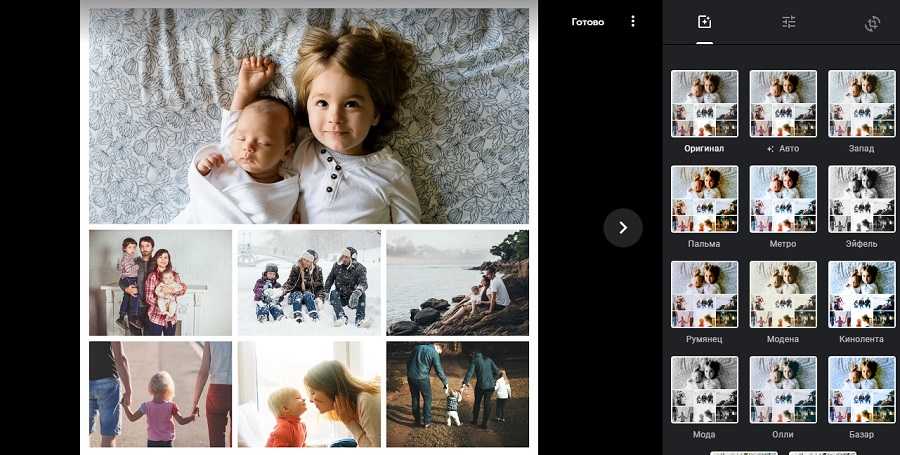 Google Photo по факту представляет из себя онлайн хранилище для разного типа медиафайлов с несколькими базовыми функциями редактирования. Однако на площадке также присутствуют несколько полезных инструментов, в том числе создание коллажей из фото. Правда, возможности довольно ограничены: склеить здесь можно не больше 9 файлов. Google Photo сам выбирает вариант размещения превью на холсте в автоматическом режиме. Вам останется лишь применить фильтры из библиотеки сайта, настроить освещение и яркость, подобрать цветовой баланс и резкость деталей. Можно даже повернуть полотно на любой угол.