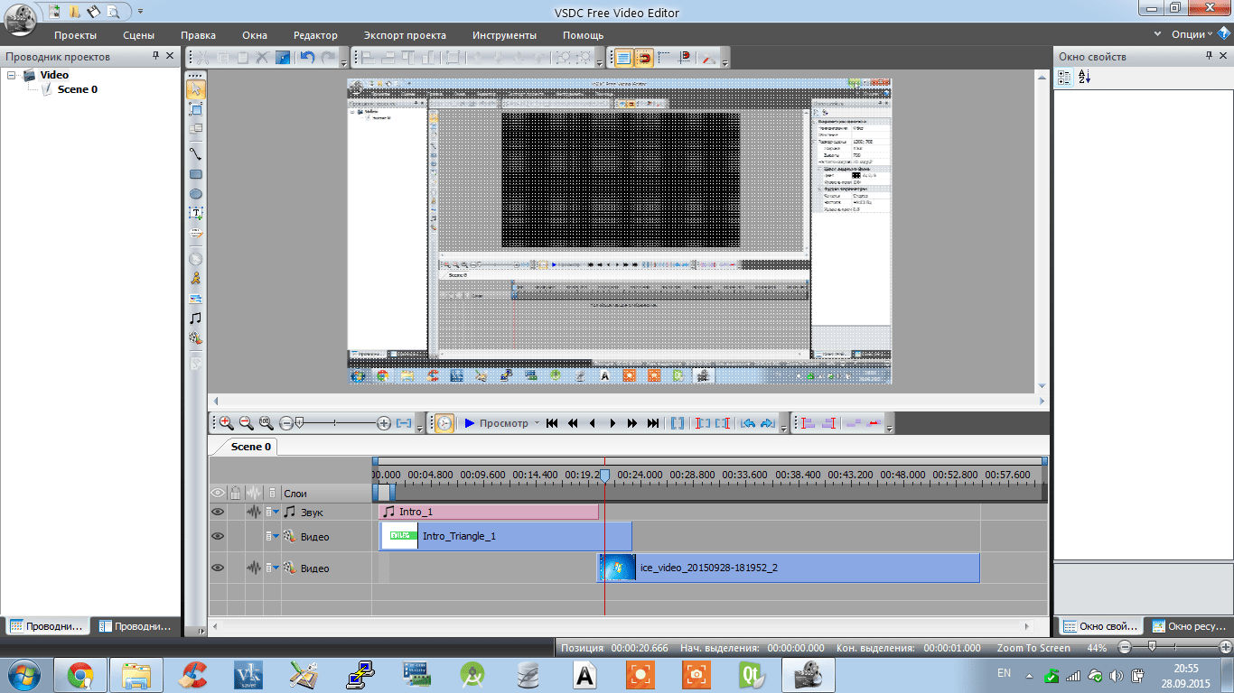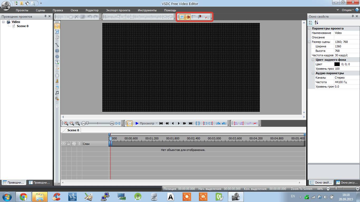 После того, как проект создан, Нам необходимо будет добавить видео и аудио дорожки на сцену. Что примечательно, при добавлении видеодорожек на экран необходимо будет растянуть по экрану ту область, в которой будет отображаться добавленная нами дорожка. Это весьма удобно, если мы захотим проигрывать два видео в одном кадре.