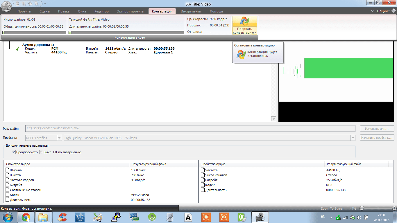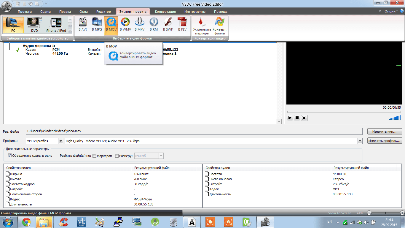 После того, как все дорожки добавлены, а эффекты настроены, мы можем приступать к конвертированию видео в нужный нам формат.