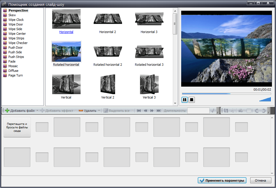 Также имеется возможность добавления эффектов перехода размытия, подписывание кадров, наложения различных прямоугольников и т.д.