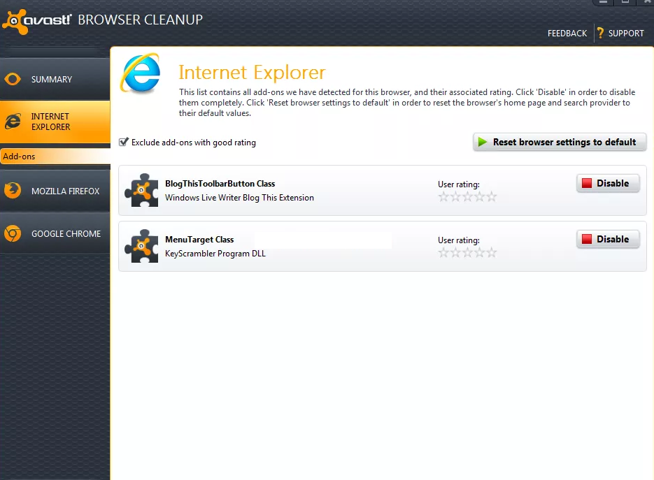 Вторая популярная бесплатная программа для проверки браузеров — Avast Browser Cleanup (проверяет нежелательные дополнения в браузерах Internet Explorer и Mozilla Firefox). После и запуска утилиты, проводится автоматическое сканирование указанных двух браузеров на расширения с плохой репутацией и, при наличии таких, соответствующие модули отображаются в окне программы с возможностью их удаления.