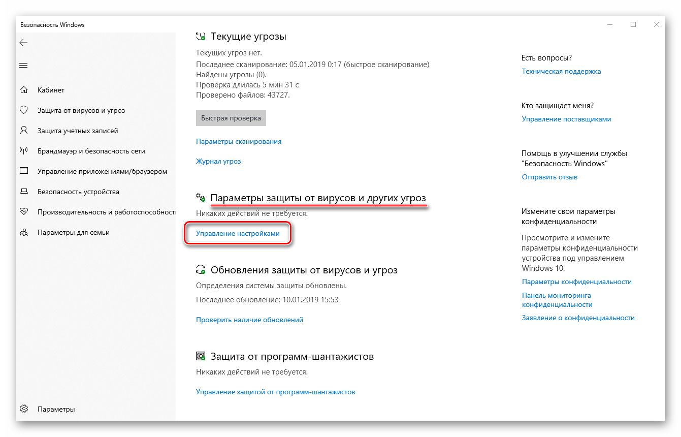 Так как Defender является встроенной программой, вы можете управлять ее работой с помощью меню конфигураций Виндовс 10. Если же они недоступны, вам потребуется активировать соответствующую службу.