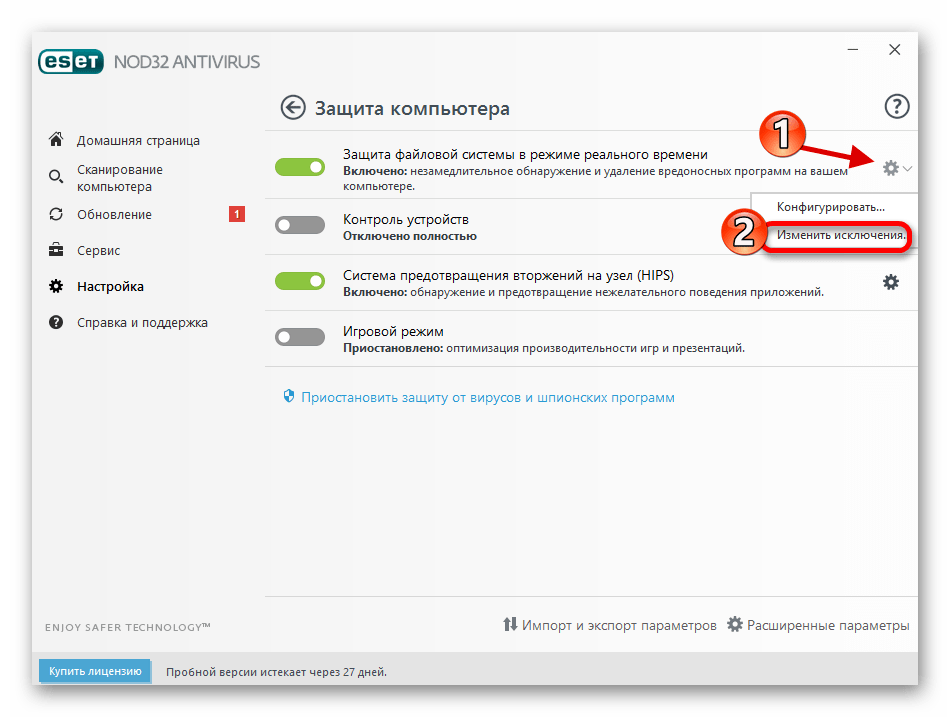 Подробнее: Добавление объекта в исключения в антивирусе NOD32