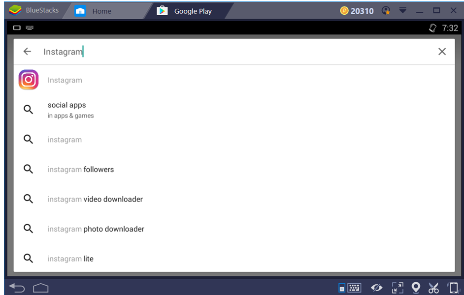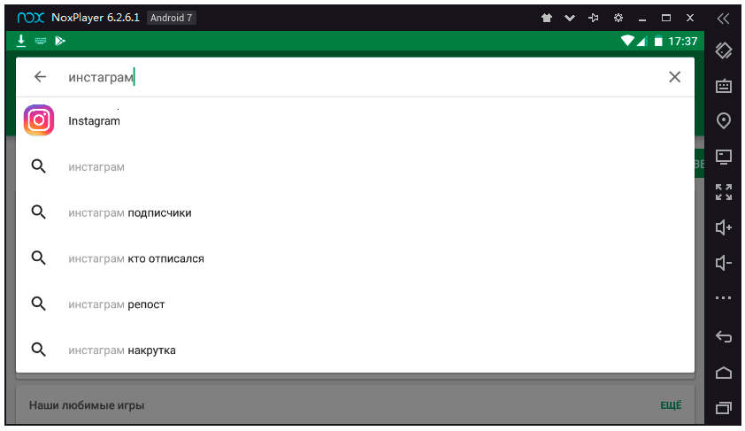 - Установить Instagram, найдя приложение через встроенный в эмулятор поиск по магазину Google Play.