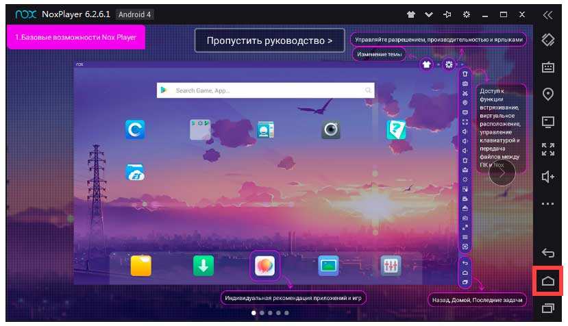 3. Запустите эмулятор Nox и перейдите на главную страницу (кнопка Домой – внизу справа).