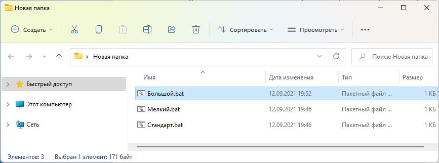 Задачу изменения размеров иконок можно упростить, если сделать для этих целей отдельные bat-файлы. Такой пакетный файл позволяет выполнять сценарий с запуском последовательности команд, выполняемых в среде командной строки. По существу, это обычные текстовые файлы, в которых прописываются эти команды, а расширение .bat, указывает операционной системе, что с этим файлом нужно делать.
