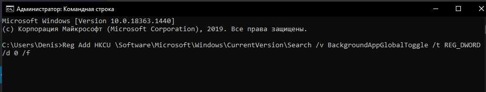 написать: «Reg Add HKCU \Software\Microsoft\Windows\CurrentVersion\BackgroundAccessApplications /v GlobalUserDisabled /t REG_DWORD /d 1 /f»;
