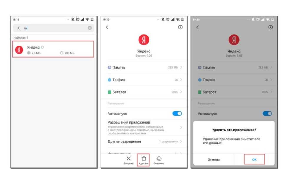 Повторите этот процесс для других элементов Яндекса, затем нажмите начальную кнопку удаления, отмеченную на изображении ниже.