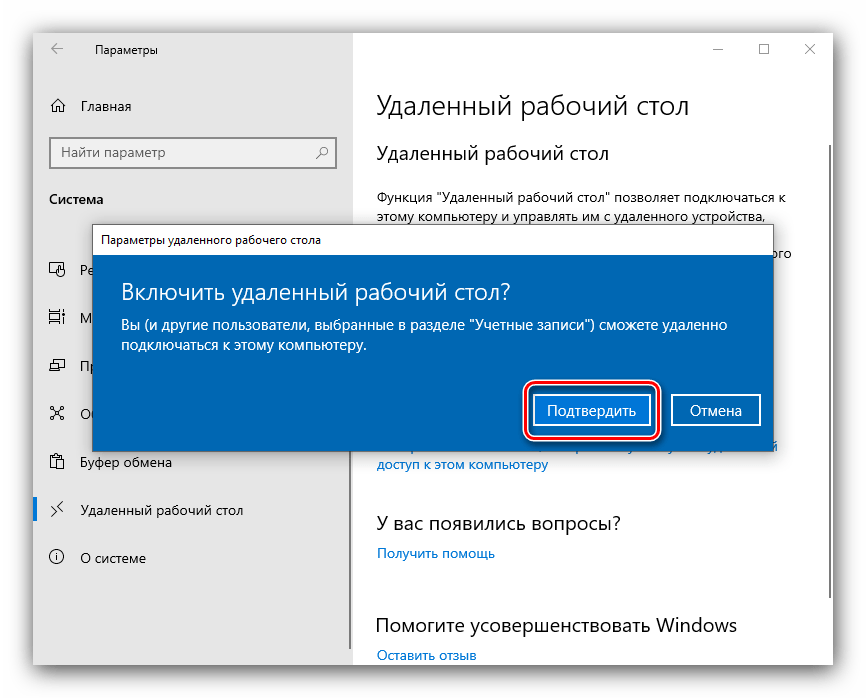 В настройках системы находим запись «Удаленный рабочий стол» и активируем переключатель.