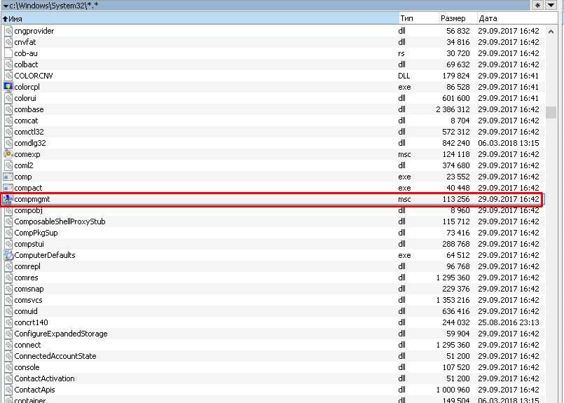 Любым файловым менеджером переходим в папку C:WindowsSystem32 и запускаем файл compmgmt.msc
