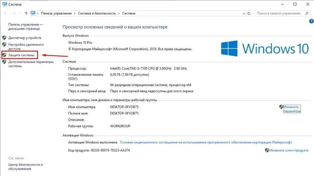 Нажимаем комбинацию клавиш Windows + Pause/Break и попадаем в уже знакомое нам окно «Просмотр основных сведений о вашем компьютере», только на этот раз нам нужна ссылка «Защита системы» в его левой части.