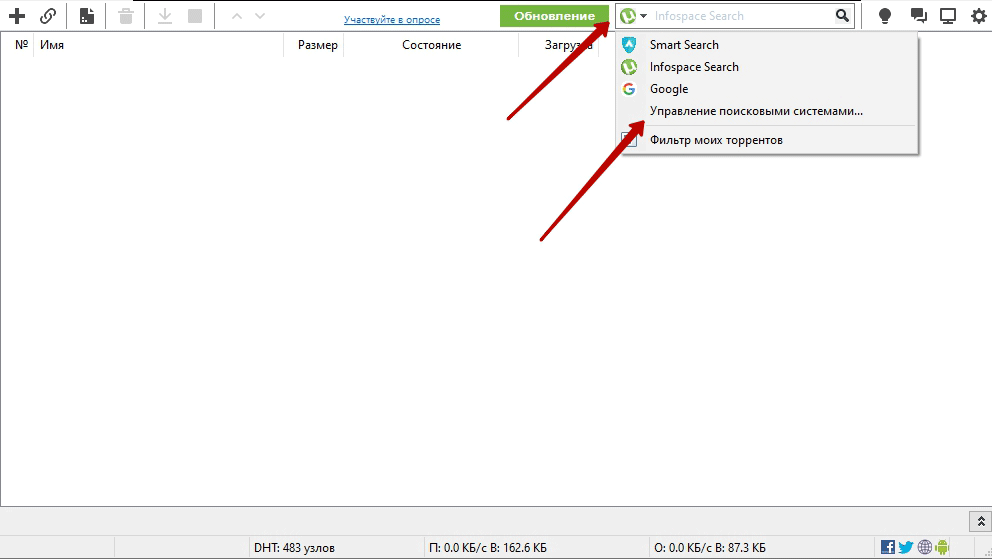 В программе есть поисковик по торрентам, но результаты поиска все равно отображаются в браузере. Используйте привычные поисковые системы Яндекс или Google. Давайте найдем и скачем фильм через торрент.