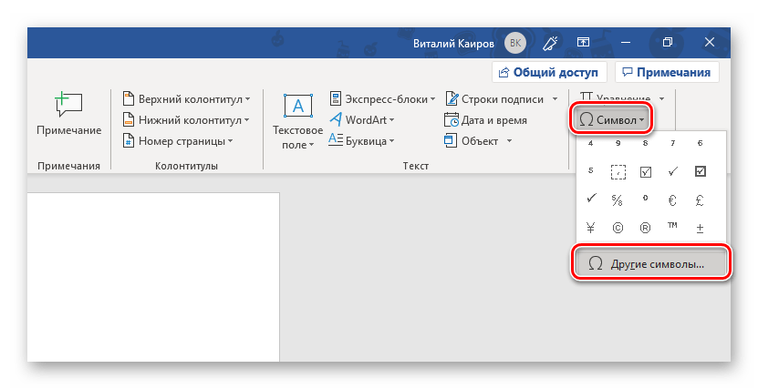 - Выберите «Символ» — «Другие»;