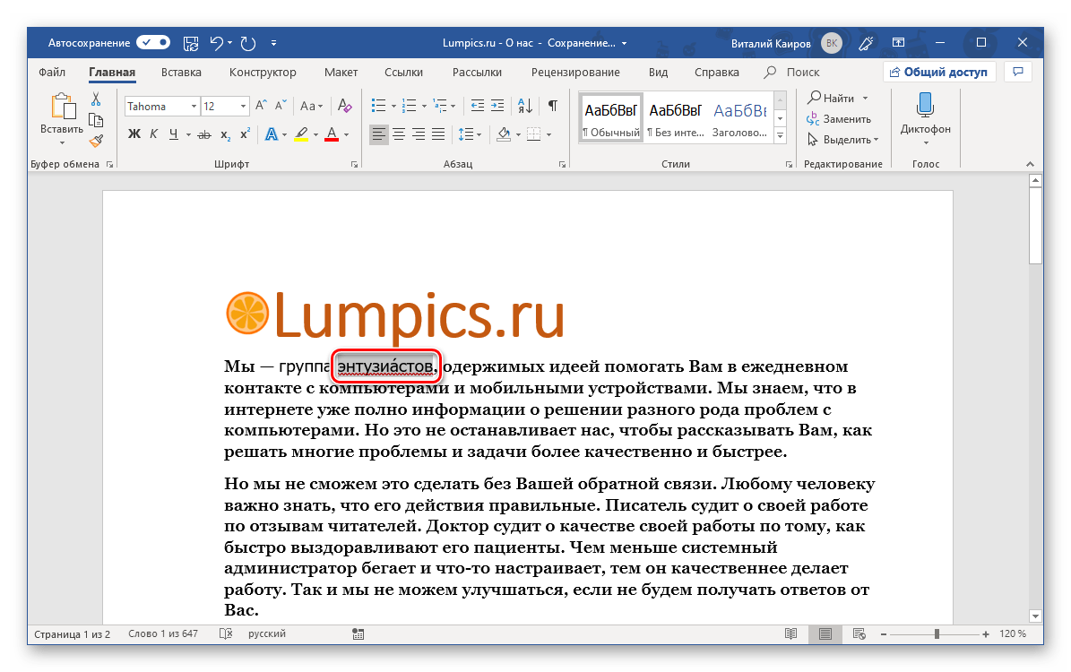 - Установите курсор сразу после буквы в слове, на которую требуется поставить ударение (в слове «энтузиастов», указанном в нашем примере, курсор установлен после буквы «а»).