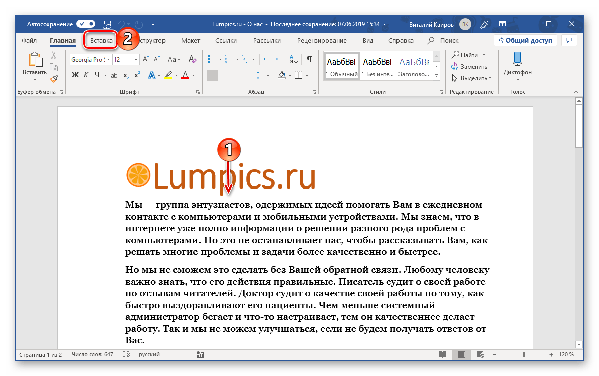 - Перейдите во вкладку «Вставка»;