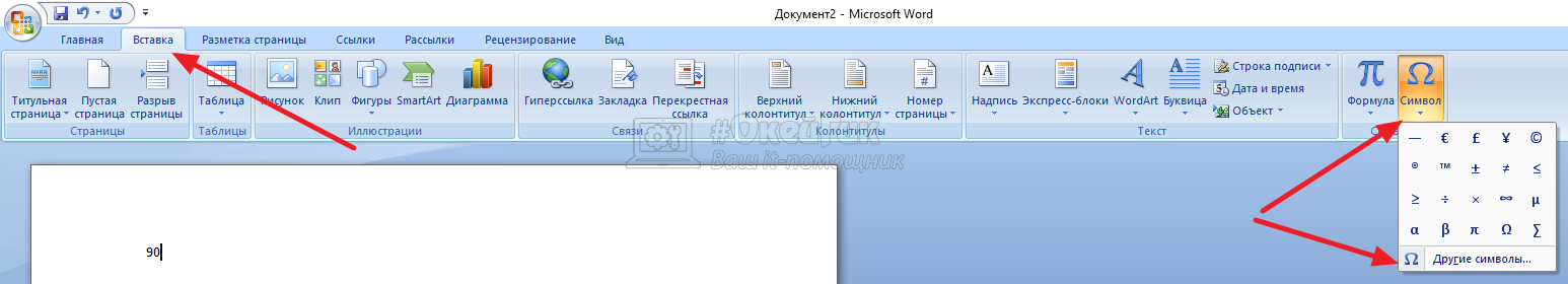 Можно вставить значок градуса в Word просто из списка символов. Для этого в верхнем меню переключитесь в раздел “Вставка” и выберите пункт “Символ”, а далее вариант “Другие символы”.