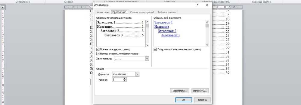 - В открывшемся окне с настройками меняются такие параметры, как заполнитель (точки возле разделов), номера страниц (их скрытие, отображение), уровни.