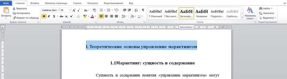 Шаг первый. Выделяем в тексте заголовки разделов. Они могут называться «частями», «главами», «пунктами». Так вот: выделяем; затем выбираем «Заголовок 1».
