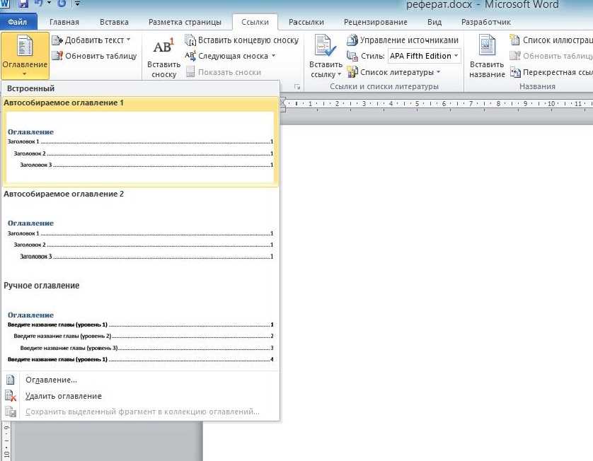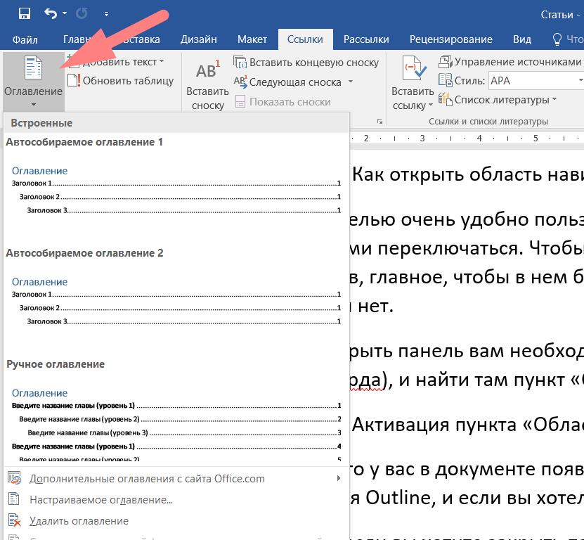 - Во вкладке «Ссылки» нажать на опцию «Оглавление» и выбрать в конце списка одноименный пункт.