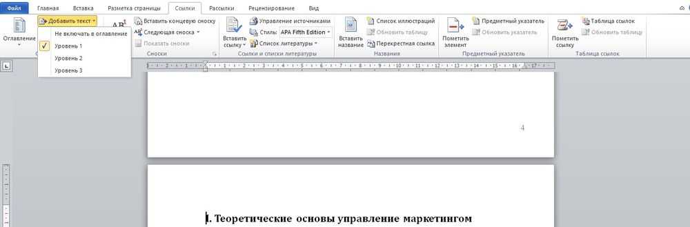 Можно поменять уровни подразделов: установить курсор перед заголовком, во вкладке «Ссылки» выбрать вариант «Добавить текст» и кликнуть по желаемому уровню.