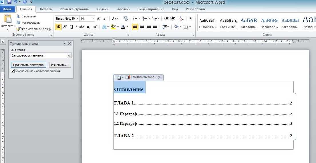 Применить соответствующие стили к названиям глав, которые требуется внести в оглавление. К примеру, для разделов – «Заголовок 1», а для подразделов – «Заголовок 2» и т.д.