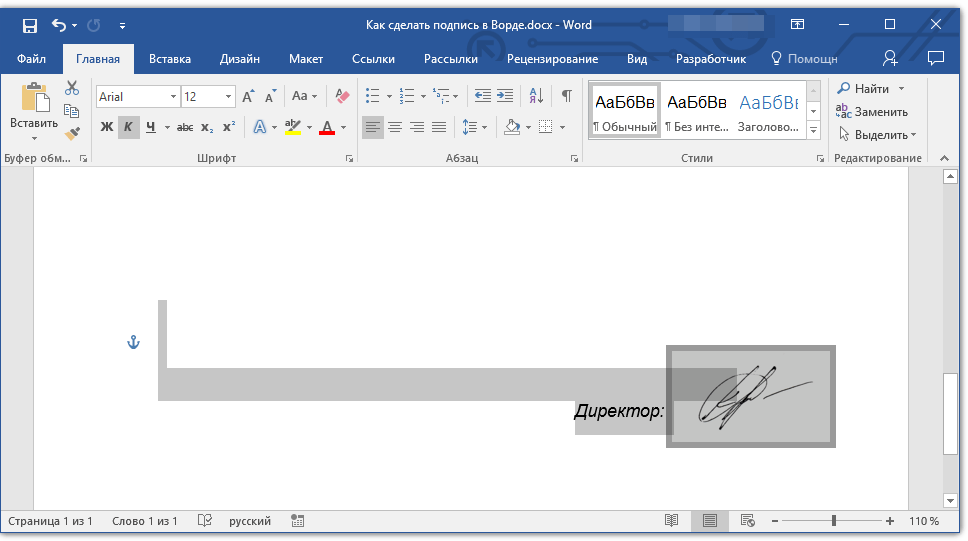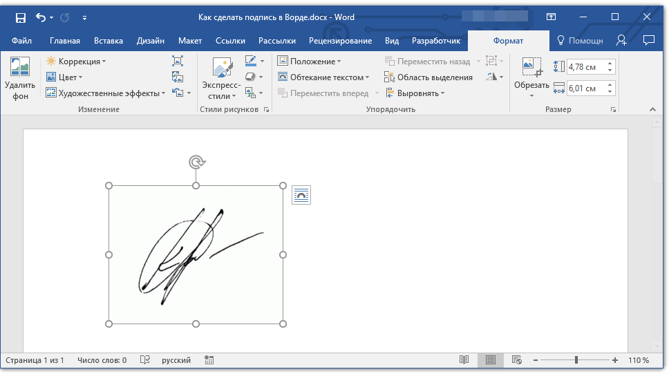 5. Переместите отсканированное, обрезанное и приведенное к необходимым размерам изображение с подписью в нужное место документа.