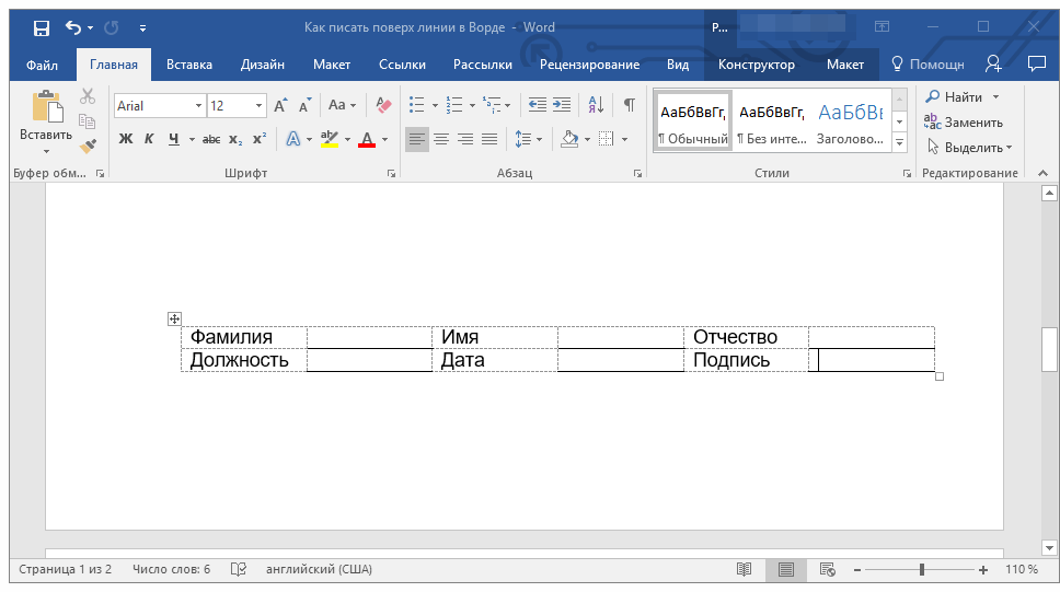 Итак, нам с вами предстоит создать простую таблицу с невидимыми левыми, правыми и верхними границами, но видимыми нижними. При этом, нижние границы будут видимыми лишь в тех местах (ячейках), где требуется добавить надпись поверх линии. Там же, где будет находиться пояснительный текст, границы отображаться не будут.