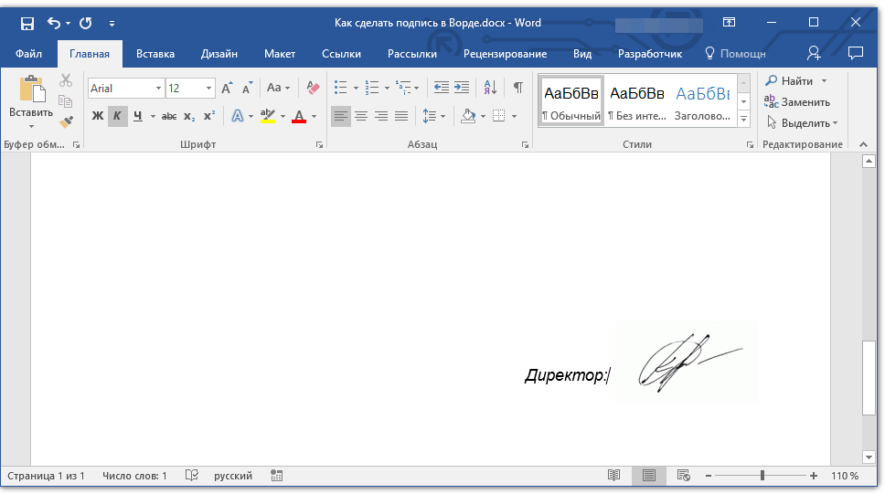 Вставка рукописной подписи с машинописным текстом