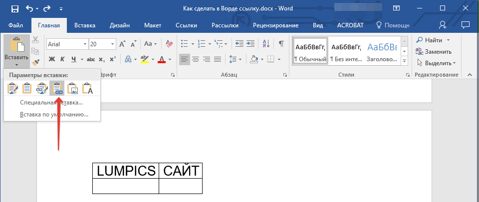 4. Во вкладке “Главная” в группе “Буфер обмена” кликните по стрелке “Вставить”, после чего в развернувшемся меню выберите “Вставить как гиперссылку”.