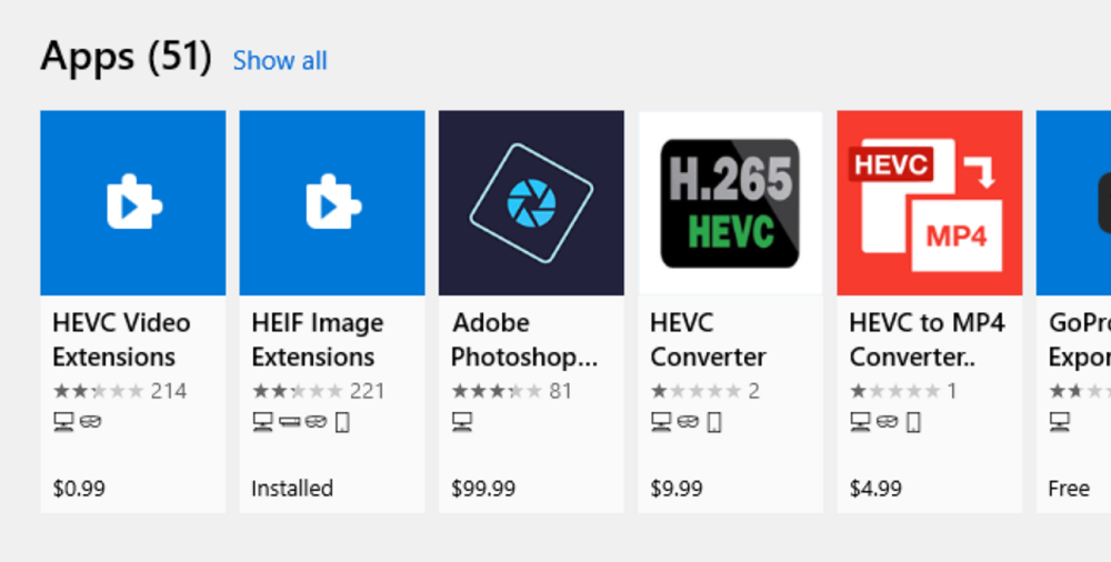 В магазине доступны два разных пакета кодеков. Оба идентичны, но один стоит $0,99, а другой бесплатный. Если вы ищете HEVC в Microsoft Store, увидите HEVC Video Extension Bundle стоимостью $0,99.