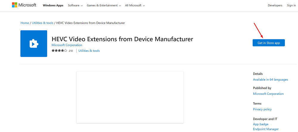 Однако вы можете получить бесплатный пакет HEVC Video Extensions From Device Manufacturer в Microsoft Store. Чтобы найти его в магазине, скопируйте и вставьте следующий текст: ms-windows-store://pdp/?ProductId=9n4wgh0z6vhq в адресную строку браузера и нажмите Enter.
