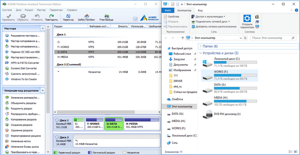 Важно! Кроме Aomei Partition Assistant, разрешается воспользоваться другими программам для разбивки накопителя. Например, Minitool Partition Wizard