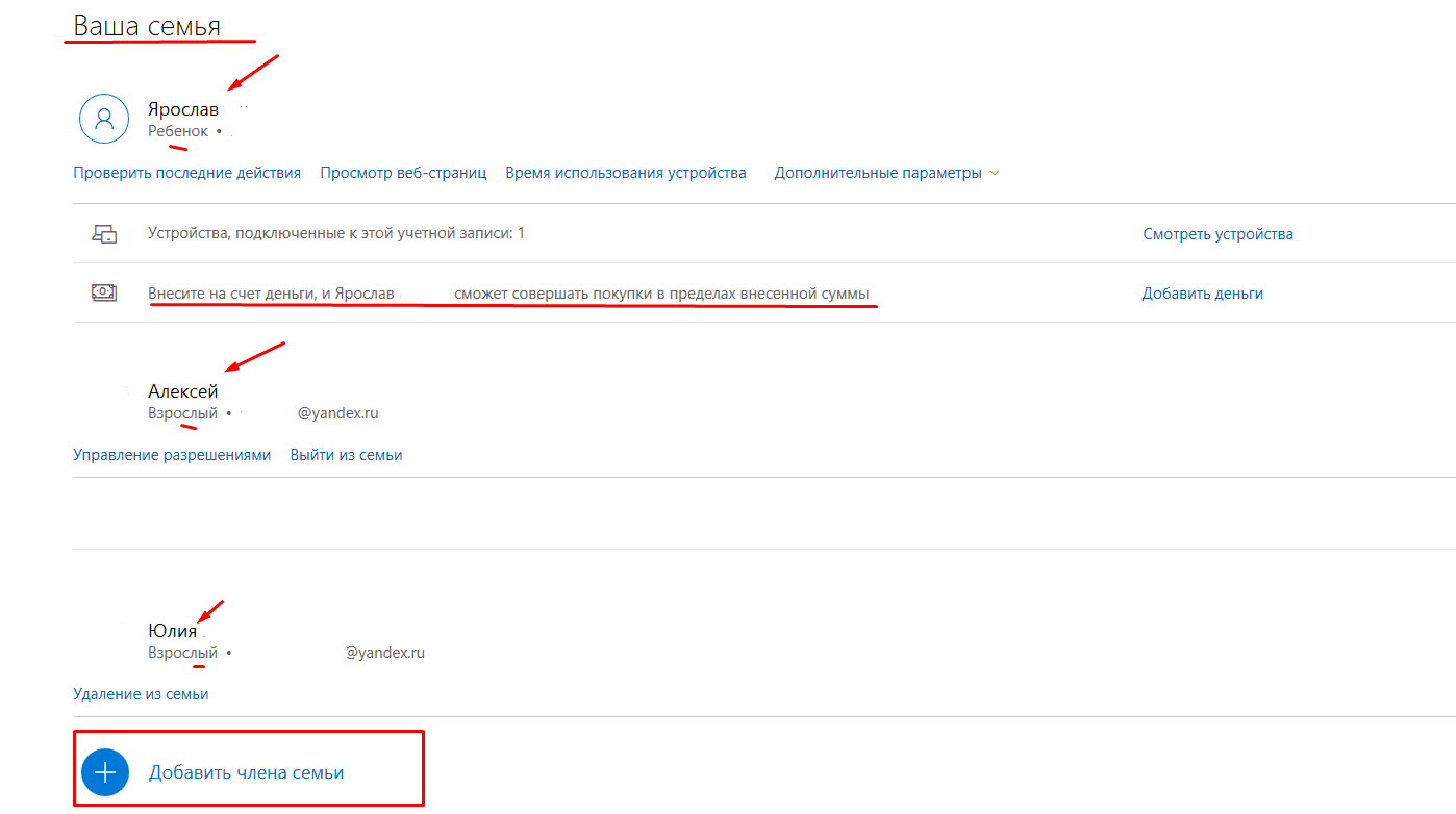 Родители могут добавлять детей и других членов семьи в свои учетные записи.