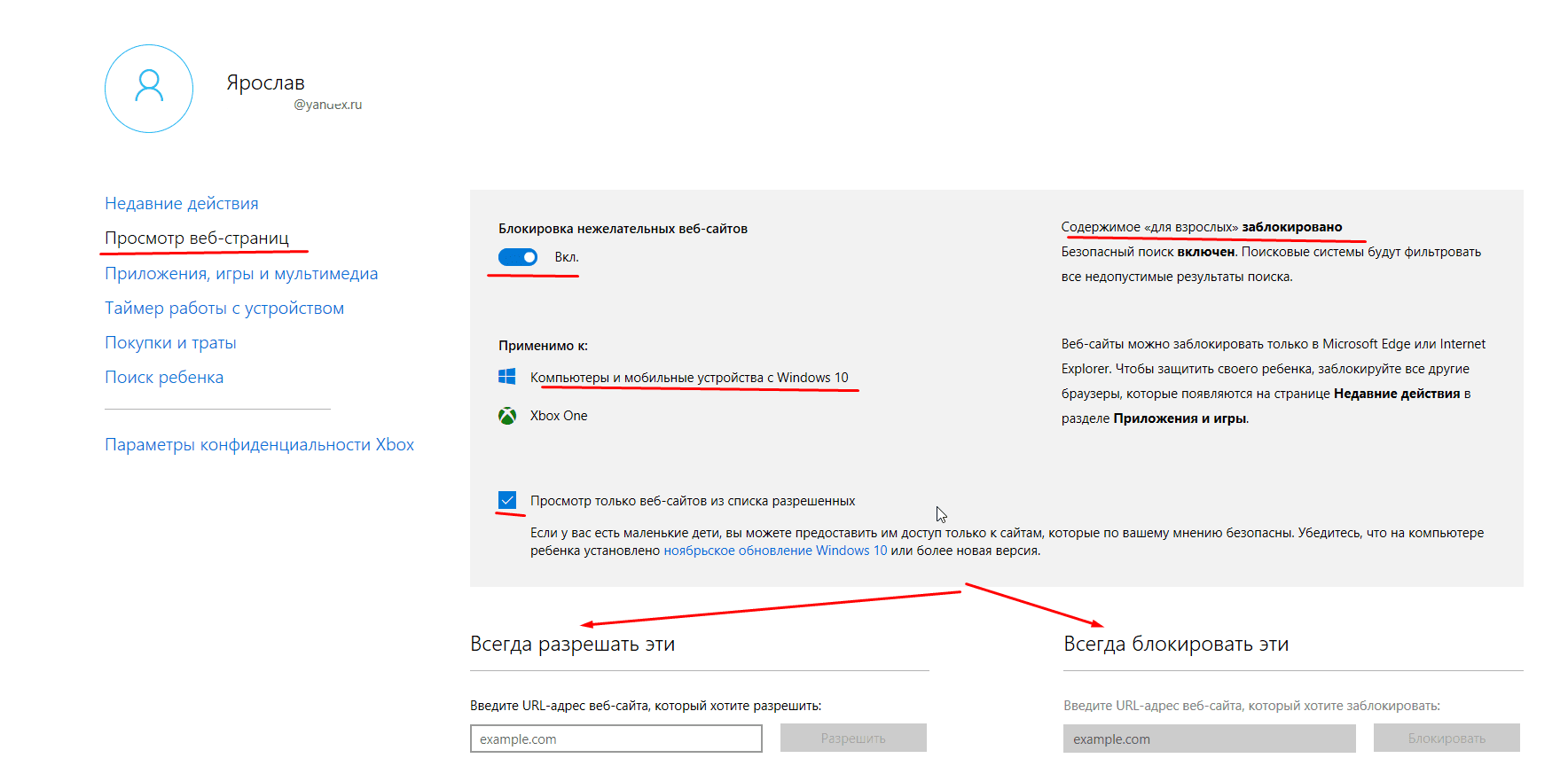 - Настройте разрешения и запрещенные действия. Например, в случае режима просмотра веб-страниц родители могут выбрать список разрешенных сайтов или создать его самостоятельно. Также можно создать черный список ресурсов, доступ к которым будет запрещен.